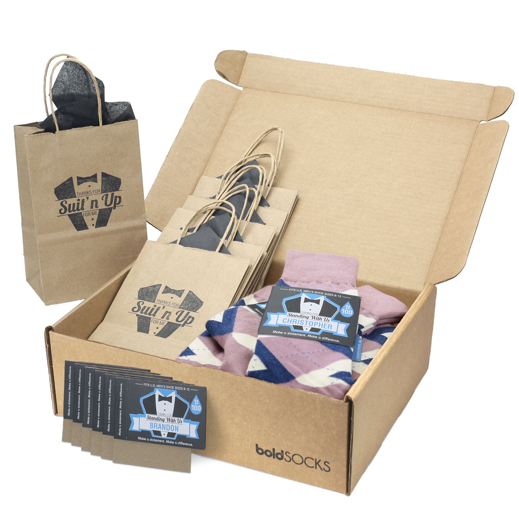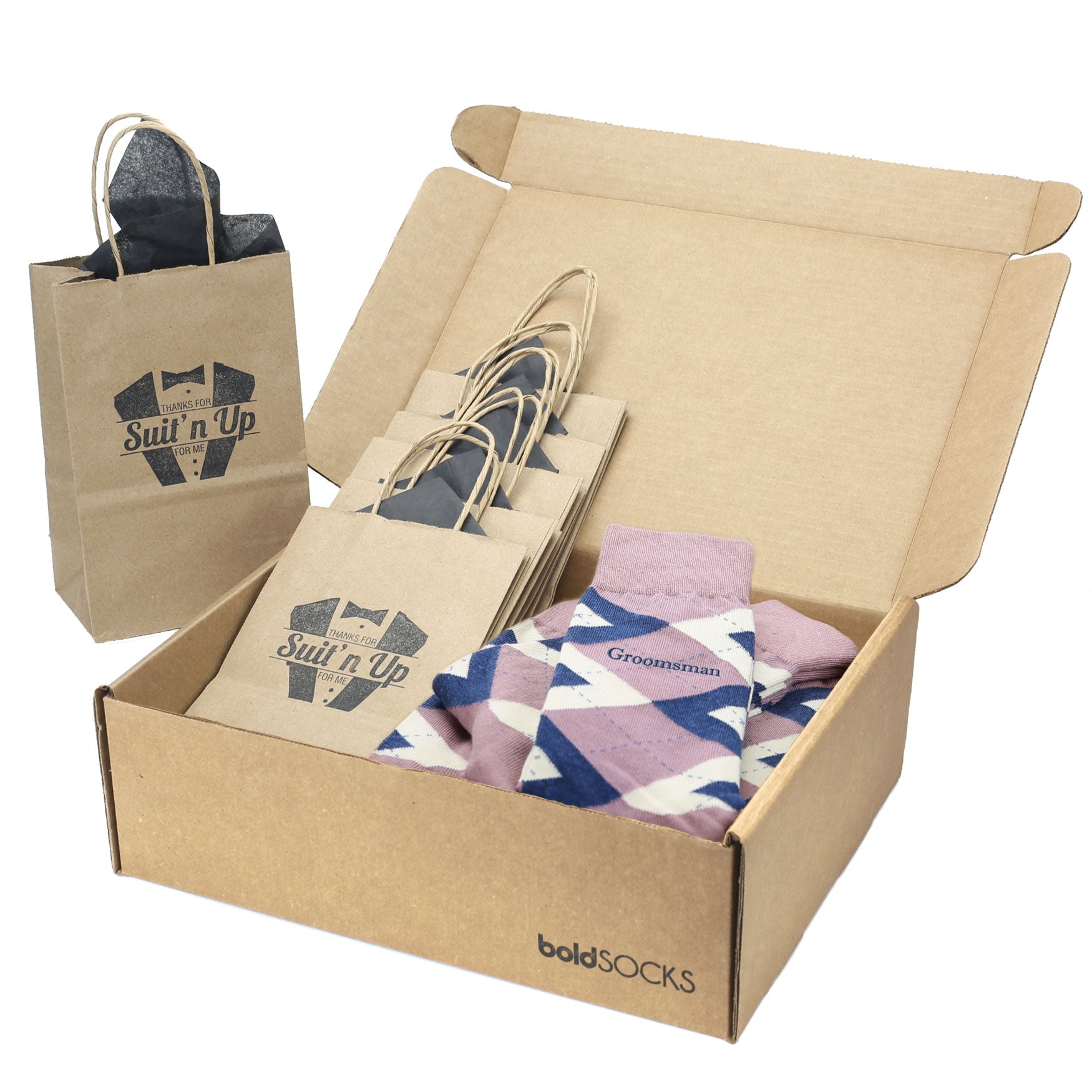 These argyle socks make stunning wedding socks and amazing groomsmen gifts! With awesome groomsmen socks, individual gift bags and tissue paper, gifts for groomsmen have never been easier. Add custom text for a personalized touch. Take it even further with custom labels, too and let your guys know how much you appreciate them suit'n up for you.